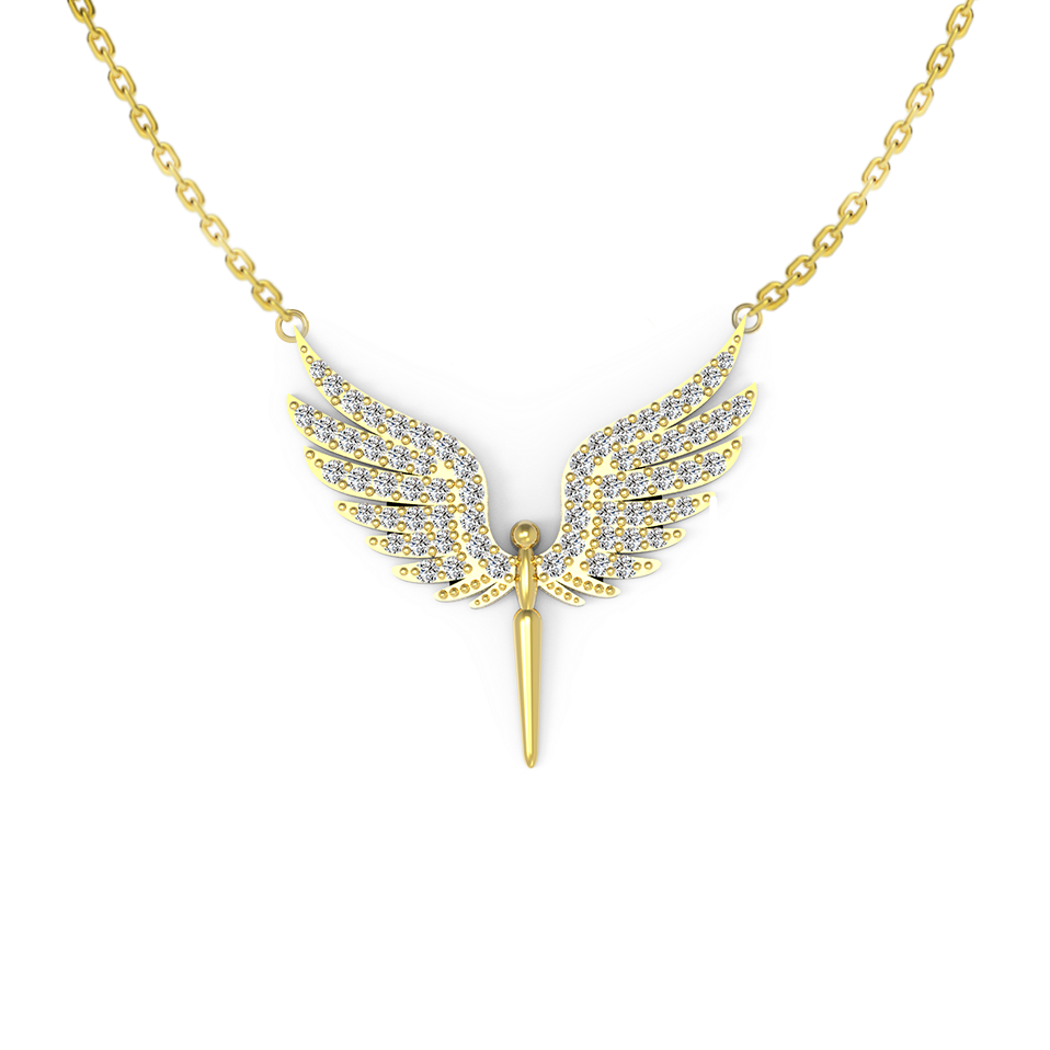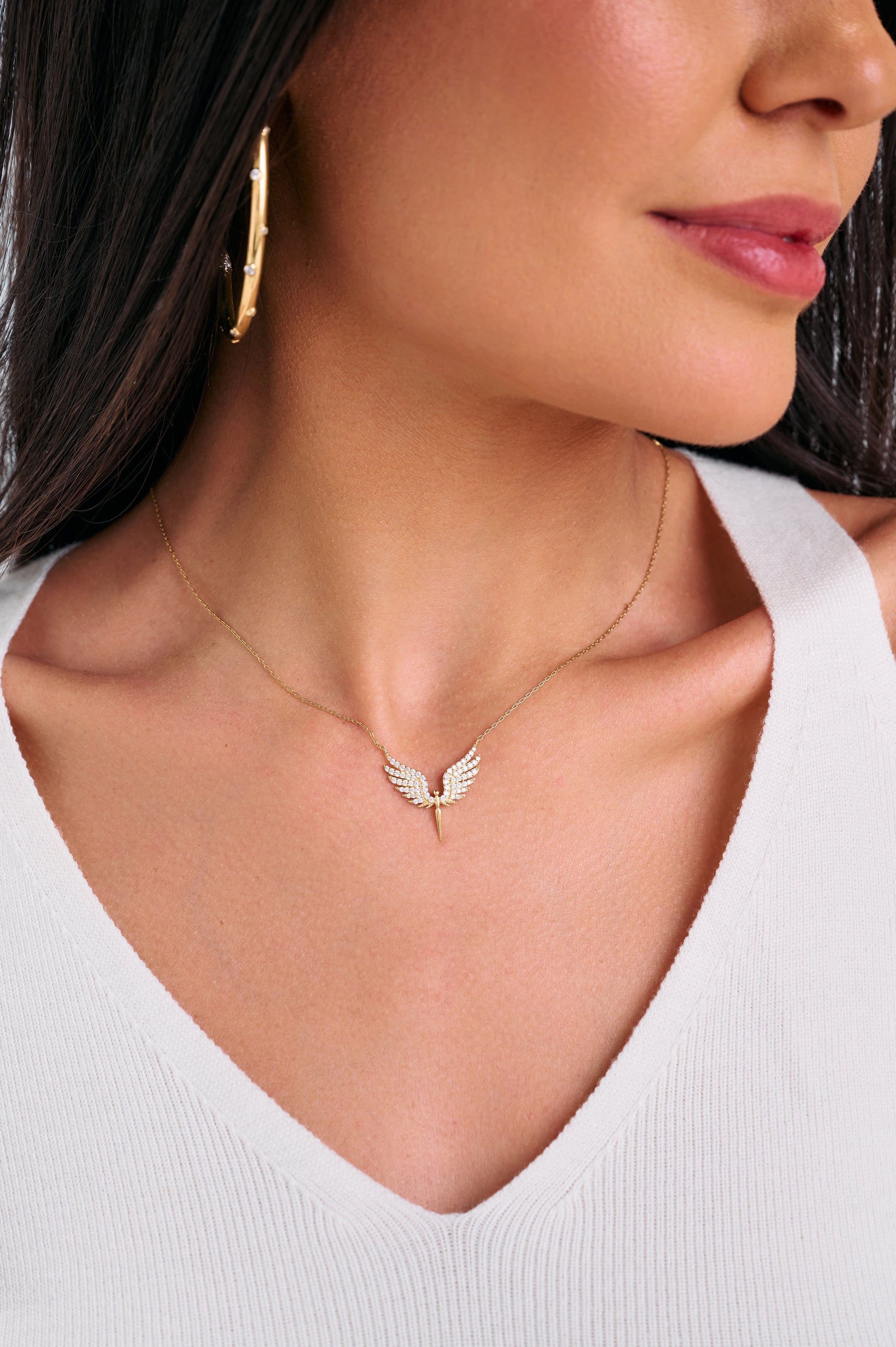 Crafted from 18k gold, it features delicate zircon-studded wings that shimmer